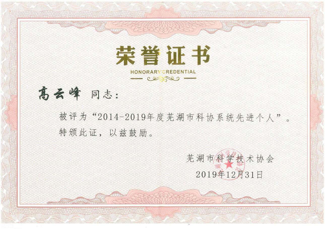 我司高云峰總經(jīng)理獲“2014-2019年度蕪湖市科協(xié)系統(tǒng)先進(jìn)個(gè)人”榮譽(yù)稱號(hào)