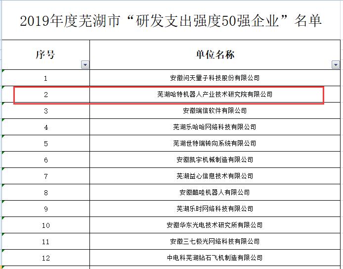 11月30日,根據(jù)《蕪湖市“研發(fā)雙50強(qiáng)企業(yè)”審核工作方案》規(guī)定,經(jīng)市科技局專(zhuān)家組審核公示,蕪湖哈特機(jī)器人產(chǎn)業(yè)技術(shù)研究院有限公司在2019年度蕪湖市“研發(fā)雙50強(qiáng)企業(yè)”評(píng)定中獲“研發(fā)支出強(qiáng)度50強(qiáng)企業(yè)”第二名。