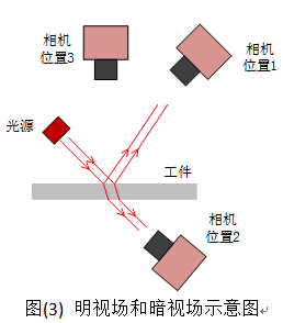 LED光源常見的照明方式根據(jù)LED和相機(jī)的位置可分為背光照明和前向照明兩種。其中背光照明示意圖如圖(1)所示。前向照明根據(jù)LED光線和相機(jī)鏡頭光軸所成角度大小又分為高角度照明、低角度照明和同軸照明,其照明示意圖分別如圖(2a),圖(2b),圖(2c)所示。根據(jù)照明的光線和相機(jī)光軸的角度照明可分為明視場(chǎng)和暗視場(chǎng),圖(3)中的相機(jī)位置1和相機(jī)位置2為明視場(chǎng),相機(jī)位置3為暗視場(chǎng)。