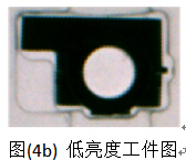 在視覺檢測(cè)中背光照明主要用于提取物體的輪廓信息,其對(duì)外界光具有較好的魯棒性。采用該方案時(shí)設(shè)置合適的光源亮度比較關(guān)鍵,尤其在工件精密的檢測(cè)中。亮度過高時(shí)在薄壁工件邊緣產(chǎn)生的衍射現(xiàn)象和亮度過低時(shí)圖像產(chǎn)生較多的噪點(diǎn)都會(huì)影響工件輪廓提取的精度。當(dāng)其他參數(shù)設(shè)置相同的情況下,光源在高亮度和低亮度時(shí)工件的圖像分別如圖(4a)和圖(4b)所示。亮度高時(shí)輪廓模糊,亮度低時(shí)圖像噪點(diǎn)比較多。