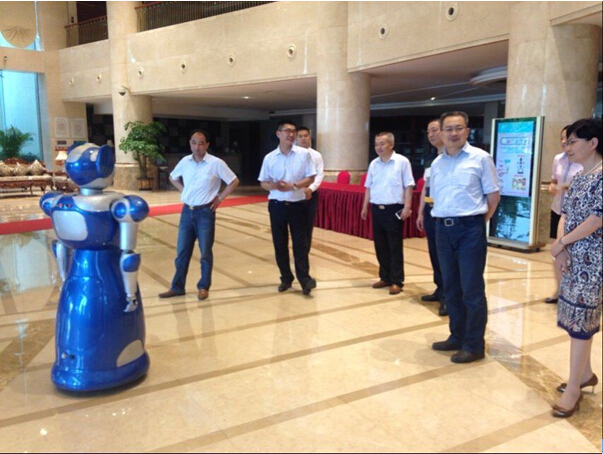 在酒店大堂,迎賓機(jī)器人正在為前來視察的蕪湖縣政府黃維群縣長(zhǎng)介紹酒店的整體情況。