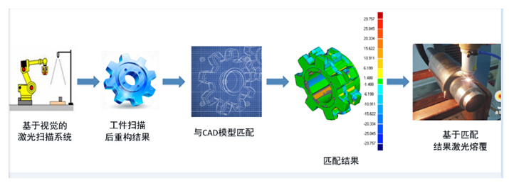 針對工件加工過程中的誤差和使用過程中磨損等情況,通過視覺技術(shù)對工件輪廓進行檢測、對檢測數(shù)據(jù)進行三維重構(gòu),并與CAD模型進行匹配,根據(jù)匹配結(jié)果規(guī)劃機器人路徑及加工參數(shù)進行加工作業(yè)。