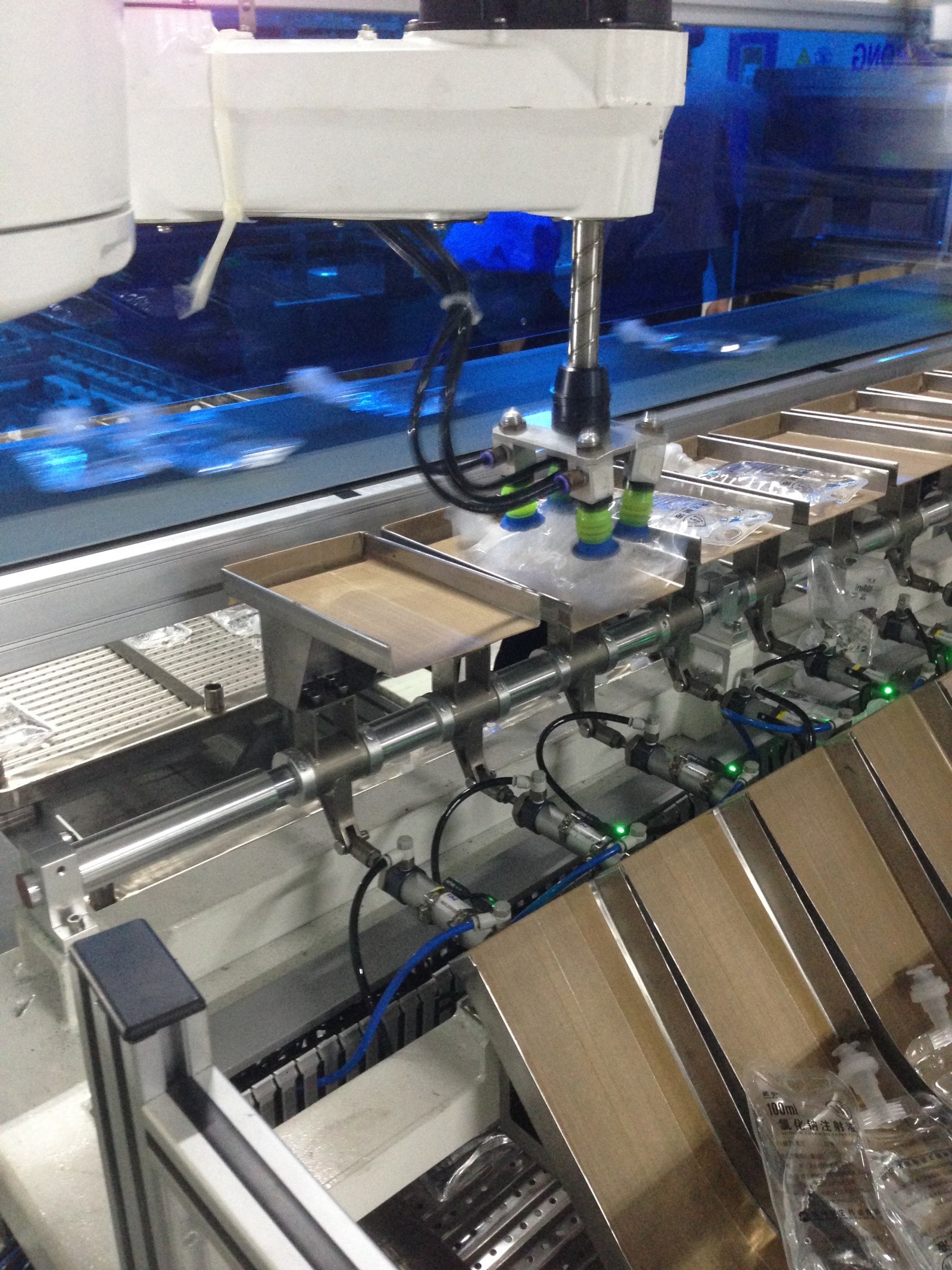 主要包含同步帶、視覺單元、拆盤機和疊盤機四個單元,能夠?qū)崿F(xiàn)輸液袋自動分揀和裝盤,視覺單元識別準確率達99%,可自動識別疊袋、皺袋,采用兩臺高速機器人保證整個系統(tǒng)的高速和穩(wěn)定的運轉(zhuǎn),定額速度達到9000袋/小時,峰值速度可達11000袋/小時。