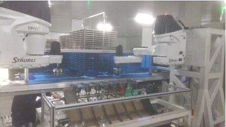 2016年8月上旬,由蕪湖哈特機(jī)器人產(chǎn)業(yè)技術(shù)研究院有限公司研制的醫(yī)用液袋SCARA機(jī)器人全自動(dòng)高速理袋生產(chǎn)線在杭州某知名制藥企業(yè)正式投入使用。該生產(chǎn)線是哈特機(jī)器人研究院瞄準(zhǔn)藥品食品行業(yè)“機(jī)器換人”,研制并投入使用的首套高技術(shù)自動(dòng)化裝備,系統(tǒng)采用兩臺(tái)史陶比爾TP80高速機(jī)器人保證整個(gè)系統(tǒng)的高速和穩(wěn)定的運(yùn)轉(zhuǎn),主要包含拆盤機(jī)、疊盤機(jī)、視覺單元、輸送線四個(gè)工位,能夠?qū)崿F(xiàn)將醫(yī)用液袋快速穩(wěn)定的碼放在托盤上,定額速度達(dá)到9000袋/小時(shí),峰值速度可達(dá)11000袋/小時(shí)。相比國內(nèi)某知名藥機(jī)生產(chǎn)企業(yè)使用開發(fā)的醫(yī)用液袋理袋生產(chǎn)線7000袋/小時(shí)的理袋速度,生產(chǎn)效率提升了30%。