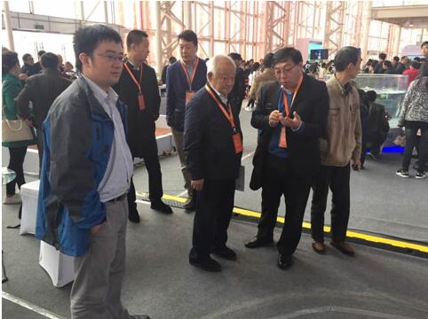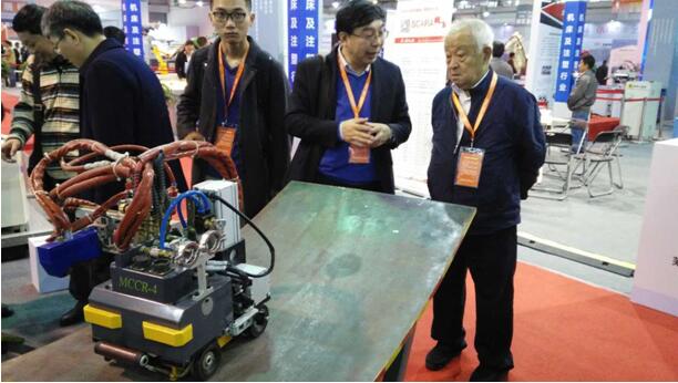高總在行健機(jī)器人展位向蔡院士介紹行健磁力爬行焊接機(jī)器人