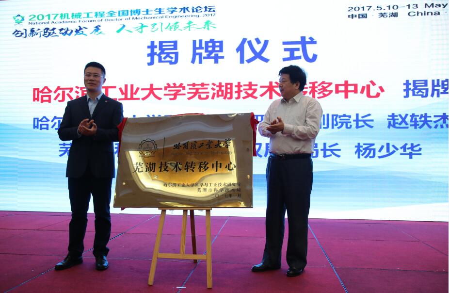 5月10日,在2017機(jī)械工程全國博士生學(xué)術(shù)論壇的開幕式上,哈工大蕪湖技術(shù)轉(zhuǎn)移中心正式揭牌。哈爾濱工業(yè)大學(xué)科學(xué)技術(shù)研究院副院長趙軼杰、蕪湖市科技局(知識產(chǎn)權(quán)局)黨組書記、局長楊少華參加了揭牌儀式。