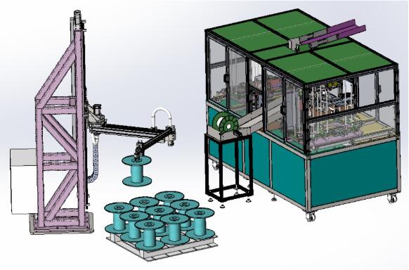 盤具組裝設(shè)備是我院根據(jù)電纜公司制盤廠需要人工制盤,工人勞動強度大,人工釘制的繞線盤質(zhì)量不穩(wěn)定等情況,而開發(fā)的全自動制盤設(shè)備。該設(shè)備可以實現(xiàn)盤片和紙筒自動定位、自動分度打釘、釘槍自動裝釘、成品自動碼垛等功能。整個制盤過程實現(xiàn)高度自動化,從而大幅提高產(chǎn)品的可靠性和一致性,并大大降低工人勞動強度。