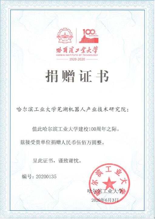 2020年6月3日,在哈爾濱工業(yè)大學(xué)建校100周年到來(lái)之際,哈爾濱工業(yè)大學(xué)蕪湖機(jī)器人產(chǎn)業(yè)技術(shù)研究院-哈爾濱工業(yè)大學(xué)教育發(fā)展基金會(huì)捐贈(zèng)儀式在校區(qū)舉行。