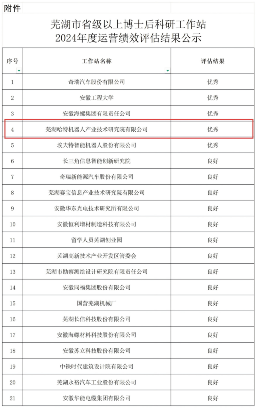 為進(jìn)一步推動(dòng)博士后事業(yè)實(shí)現(xiàn)更高質(zhì)量、更可持續(xù)發(fā)展,蕪湖市人社局與財(cái)政局聯(lián)合組織了2024年度全市博士后科研工作站運(yùn)行績效評估工作。根據(jù)評估結(jié)果公示,蕪湖哈特機(jī)器人產(chǎn)業(yè)技術(shù)研究院有限公司博士后科研工作站表現(xiàn)突出,獲評“優(yōu)秀”等次。