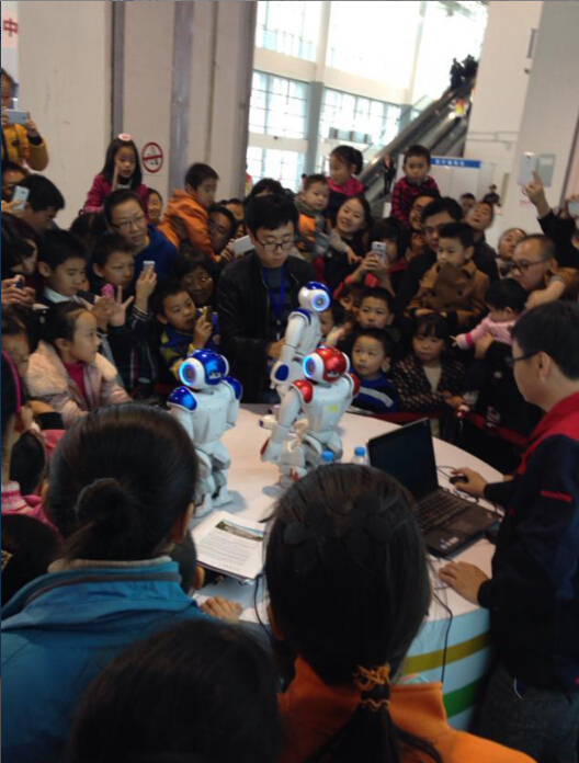 Nao機(jī)器人代表著當(dāng)今國(guó)際人形機(jī)器人的最高水平,可以實(shí)現(xiàn)人機(jī)交互、唱歌、跳舞等功能。這次展會(huì)主要展示了我院研發(fā)技術(shù)人員二次開發(fā)的成果,主要節(jié)目包括:太極拳、上海舞、江南style等節(jié)目。機(jī)器人憨態(tài)可掬,招人喜歡,成為小朋友們喜愛(ài)的小伙伴。
