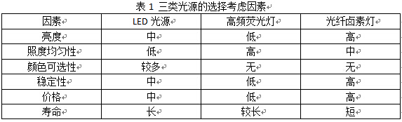 目前視覺檢測(cè)系統(tǒng)中常用的光源有LED光源,高頻熒光燈,光線鹵素?zé)羧?。該三類光源的選擇時(shí)主要考慮的因素如表1所示。