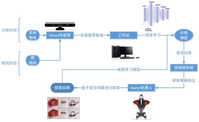 通過Kinect傳感器獲取多種物體的彩色和深度圖像數據,將數據傳輸到工作站輸入深度學習網絡模型進行訓練和建立模型,再通過深度網絡預測結果制定抓取策略,基于圖像視覺伺服執(zhí)行抓取動作,根據抓取結果不斷更新模型參數,使得網絡和系統(tǒng)更加魯棒。