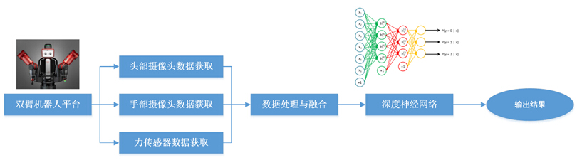 采用基于深度學(xué)習(xí)的試錯法(try-and-error)實(shí)現(xiàn)雙臂機(jī)器人的雙臂協(xié)同作業(yè)。機(jī)器人通過多種傳感設(shè)備(頭部攝像頭、手部攝像頭以及手部的力傳感器等)獲取多種模態(tài)數(shù)據(jù),對數(shù)據(jù)進(jìn)行預(yù)處理并進(jìn)行融合后輸入深度神經(jīng)網(wǎng)絡(luò),通過不斷嘗試最終獲取模型參數(shù)完成復(fù)雜作業(yè)。