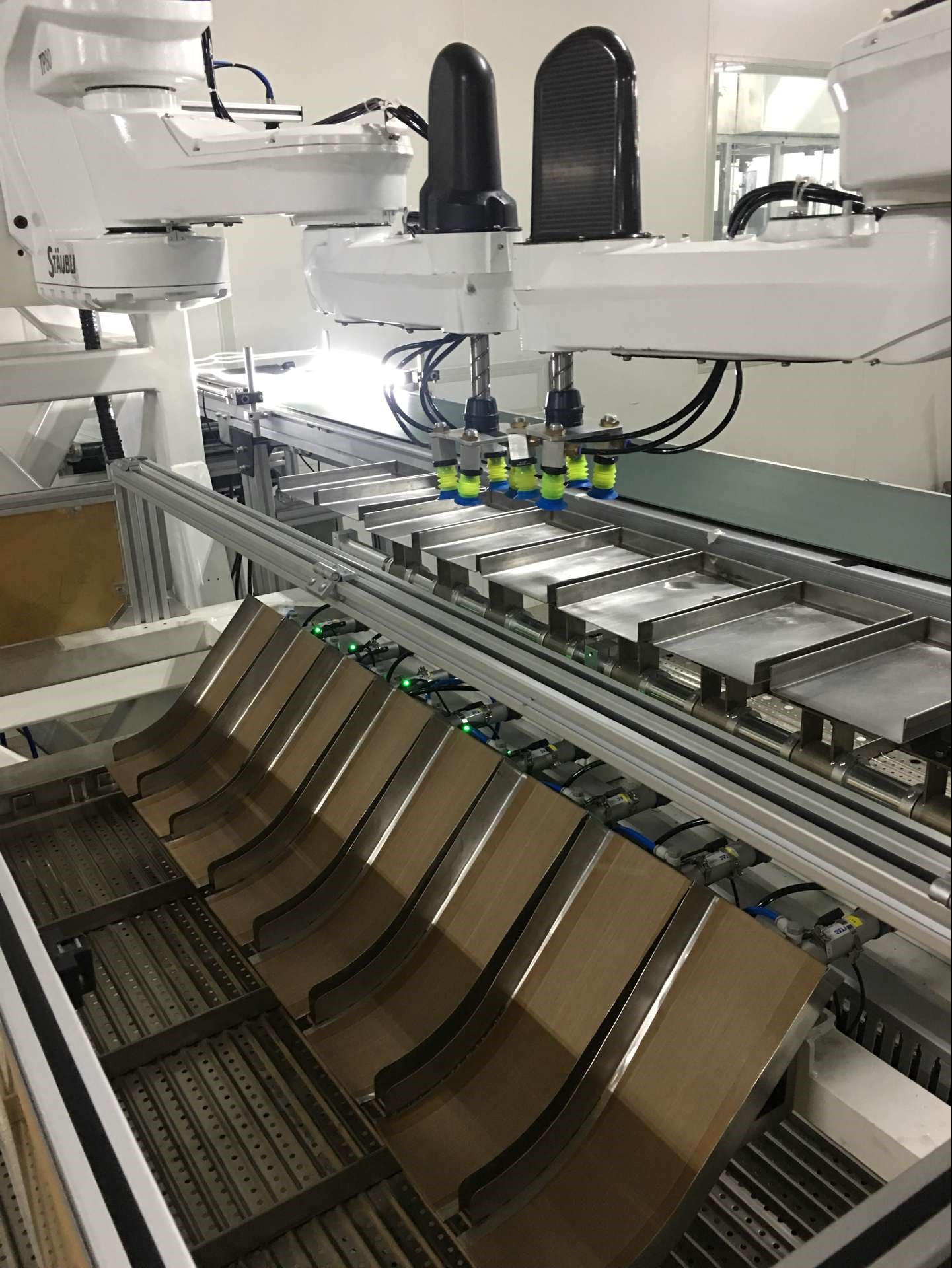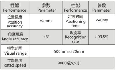 主要包含同步帶、視覺單元、拆盤機和疊盤機四個單元,能夠?qū)崿F(xiàn)輸液袋自動分揀和裝盤,視覺單元識別準確率達99%,可自動識別疊袋、皺袋,采用兩臺高速機器人保證整個系統(tǒng)的高速和穩(wěn)定的運轉(zhuǎn),定額速度達到9000袋/小時,峰值速度可達11000袋/小時。