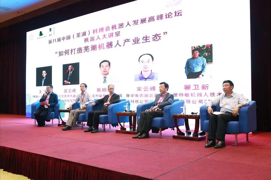 此外,展會期間,還舉辦了機(jī)器人大講壇專場活動(dòng),論壇以“創(chuàng)新驅(qū)動(dòng)蕪湖機(jī)器人產(chǎn)業(yè)生態(tài)打造”為主題,邀請了眾多機(jī)器人界知名大咖、業(yè)界300余位精英齊聚一堂。圓桌論壇環(huán)節(jié),哈特研究院高云峰副院長與《機(jī)器人技術(shù)與應(yīng)用》常務(wù)副主編王偉先生、中關(guān)村融智特種機(jī)器人聯(lián)盟秘書長陳曉東先生、舜宇集團(tuán)副總裁兼舜宇智能科技公司副總經(jīng)理宋云峰先生、傲特敏機(jī)器人技術(shù)有限公司瞿衛(wèi)新先生共同探討了“如何打造蕪湖機(jī)器人產(chǎn)業(yè)生態(tài)”這一論題。